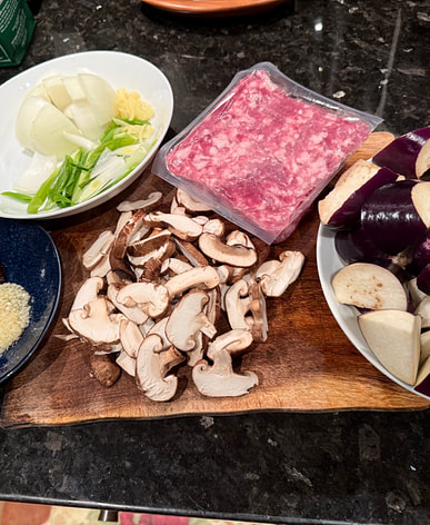 Stir fried with onion, fresh shitake mushrooms, ground pork, eggplant, chopped garlic and Lee Kum Kee black bean sauce, ginger, and green onion.