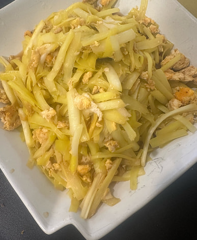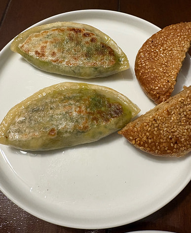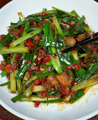 Stir-fried shredded pork with chives; chive and corn dumplings. The chive flavor is very strong.