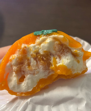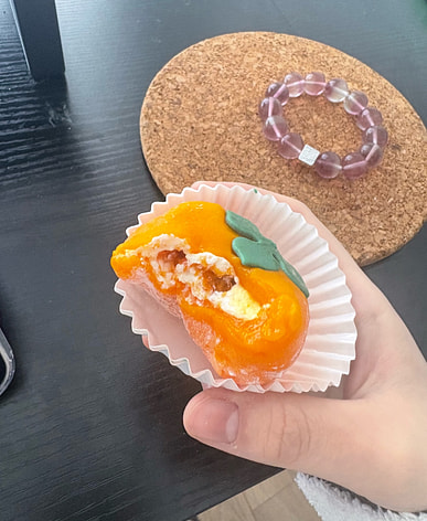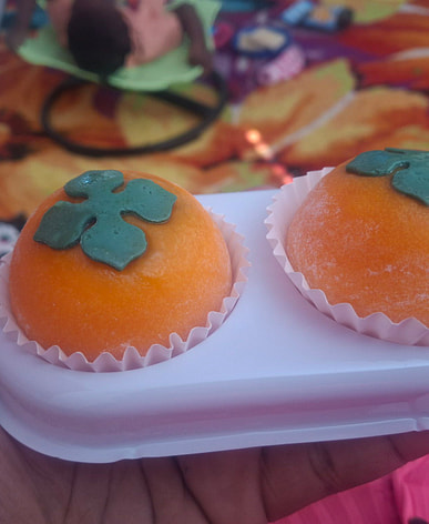 It doesn't feel as bursting with filling as the last time I bought it! There's some persimmon jam around the edges near the mochi skin, and the center is made of chunks of frozen persimmon? I remember before it had a burst of filling in the center, and you could even chew on the persimmon tongue.