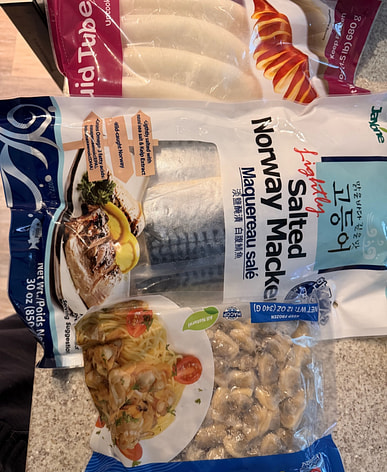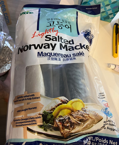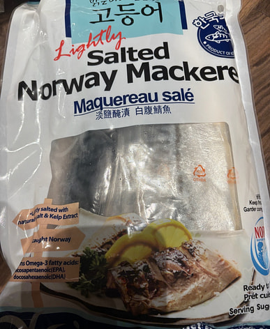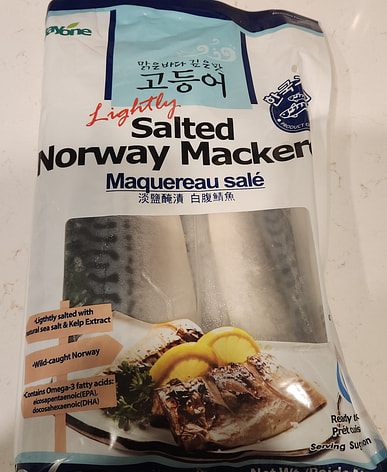 I hadn't been able to get Norwegian mackerel, but I found this big bag of it on Weee. Although it's from Korea, the reviews were good, so I bought a bag to try. There are six individually vacuum-packed slices inside, which look similar to those from Norway. I'll bake two slices tonight.