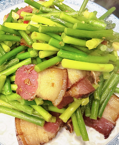 The stir-fried garlic sprouts with cured pork was very fresh and delicious.