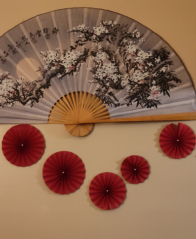 Paper cutouts, often in red, are used as window decals and portray various themes of good fortune, happiness, wealth etc.