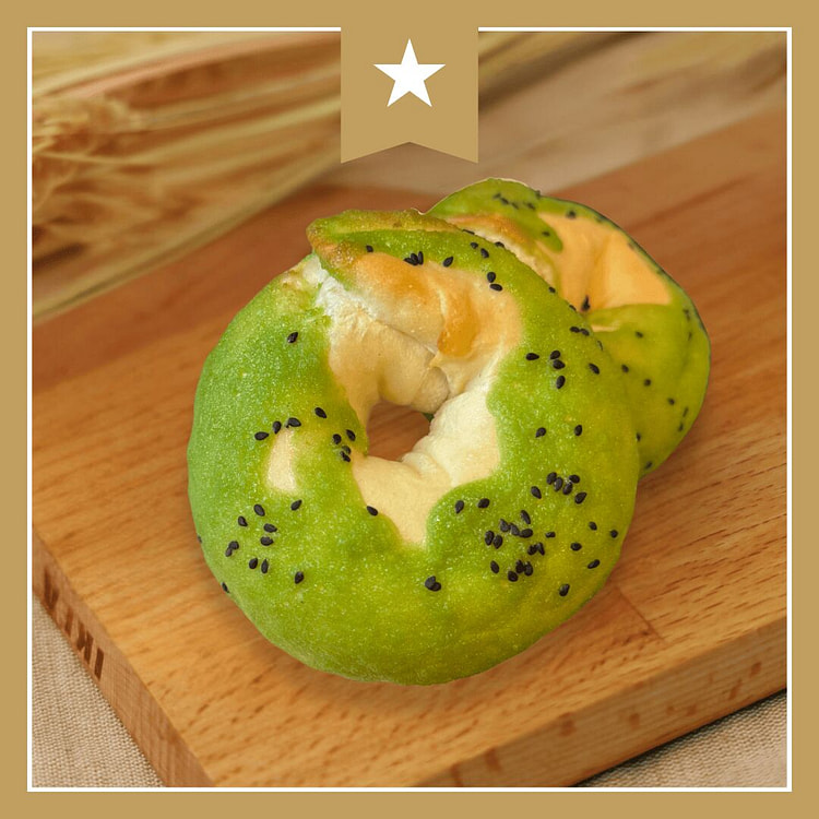 Matcha red bean bread has a light matcha aroma and is full of red beans. The bread is very delicious but a little sweet, so it goes well with black coffee.