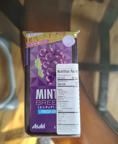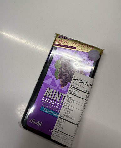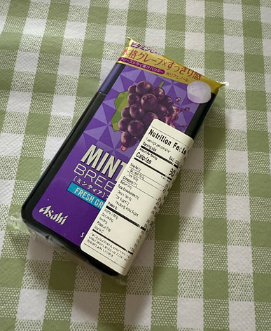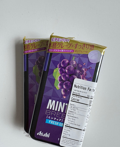 Upon opening the package, a strong grape scent immediately fills the air; the packaging indicates the use of flavoring. Being a Japanese product, its quality is reliable. Overall, it's small, portable, and tastes like a grape-flavored mint.