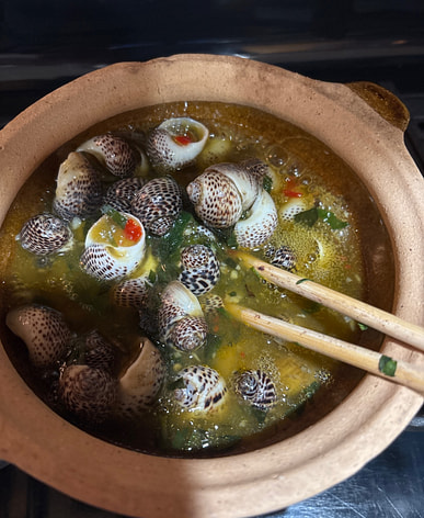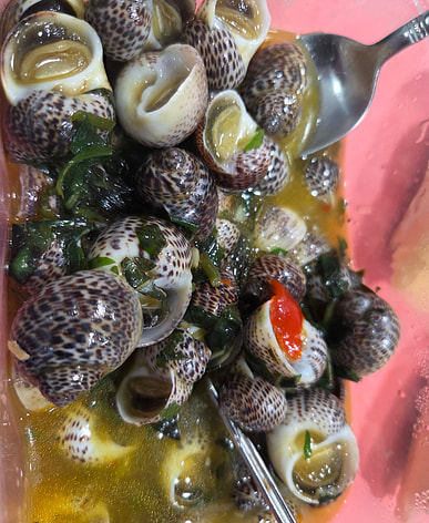 This stir-fried snails with coconut milk dish is delicious, but it's a bit difficult to eat because many of the snails haven't had their shells cut off yet. I've bought it many times before