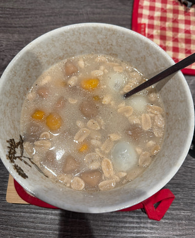 On a cold day, a dessert is a must after dinner. This was milk and peanut soup with glutinous rice balls—so delicious, but I forgot to take a picture!