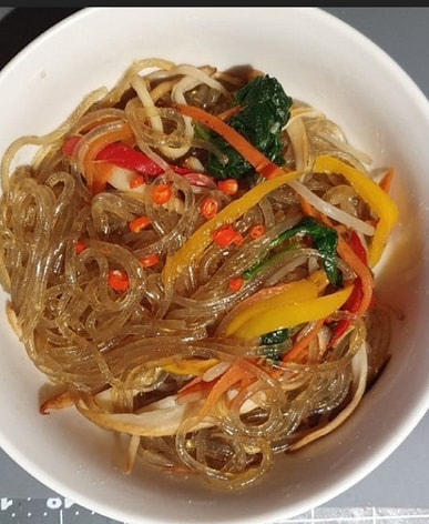 Korean Japchae with fresh ingredients: King Oyster mushroom, spinach, bell peppers, beansprouts, carrot.