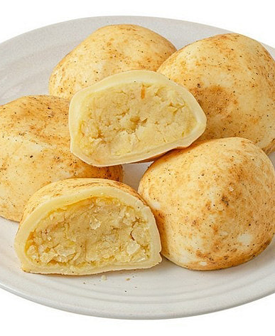The flavor is on the sweeter side, like mochi wrapped in mashed potatoes.