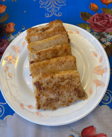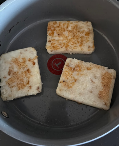 The radish cake is delicious and it's already been cut.