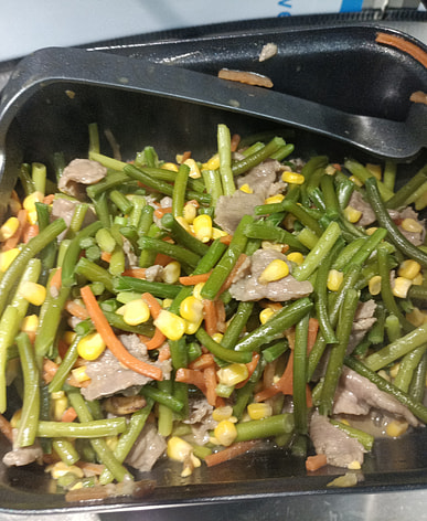 Garlic sprouts, carrots, and corn stir-fried with beef—it's absolutely delicious.