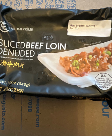 Seasoned and tender beef slices, frozen 12 oz., onion beef, very tender.