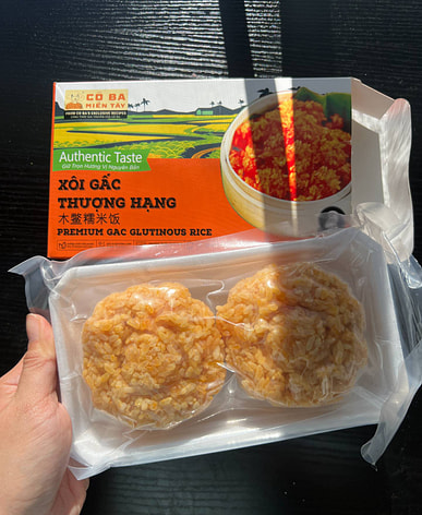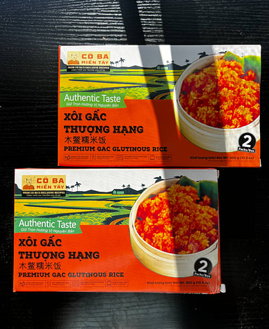 This brand of gac fruit sticky rice is delicious; you can eat it as soon as you microwave it.