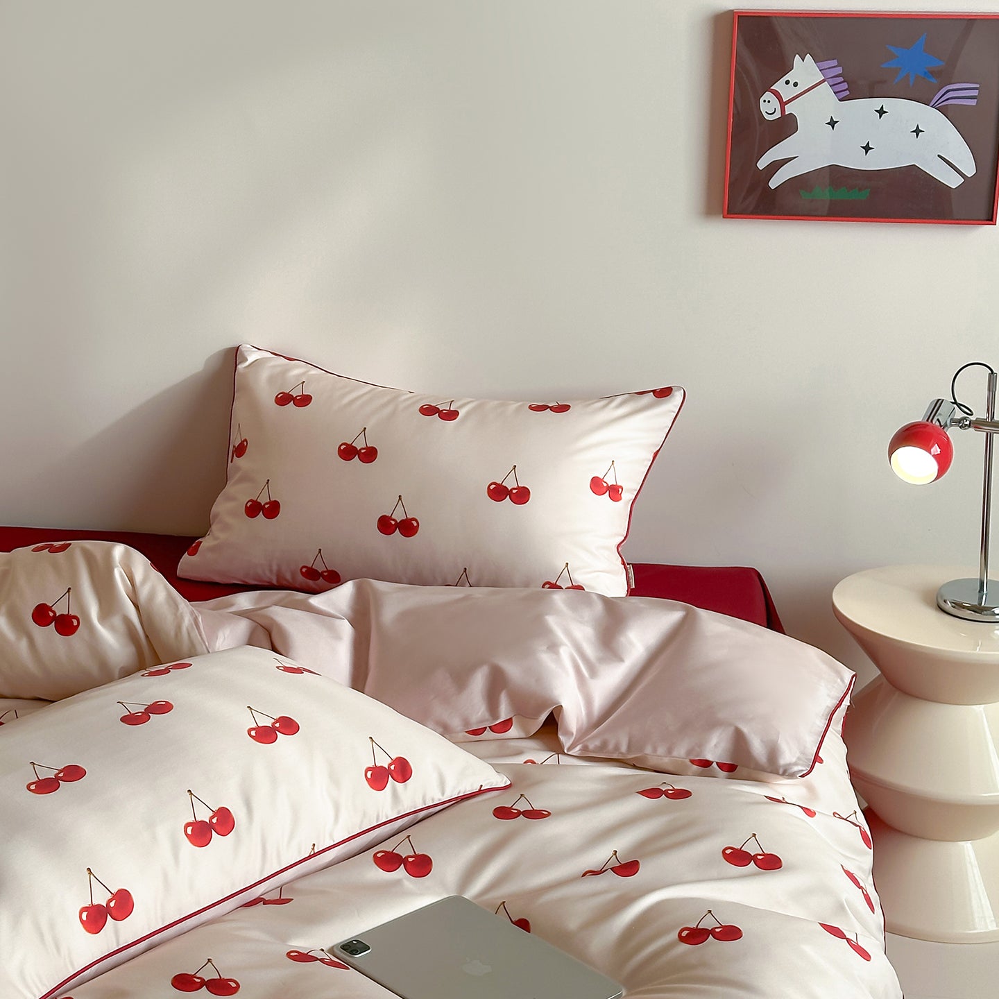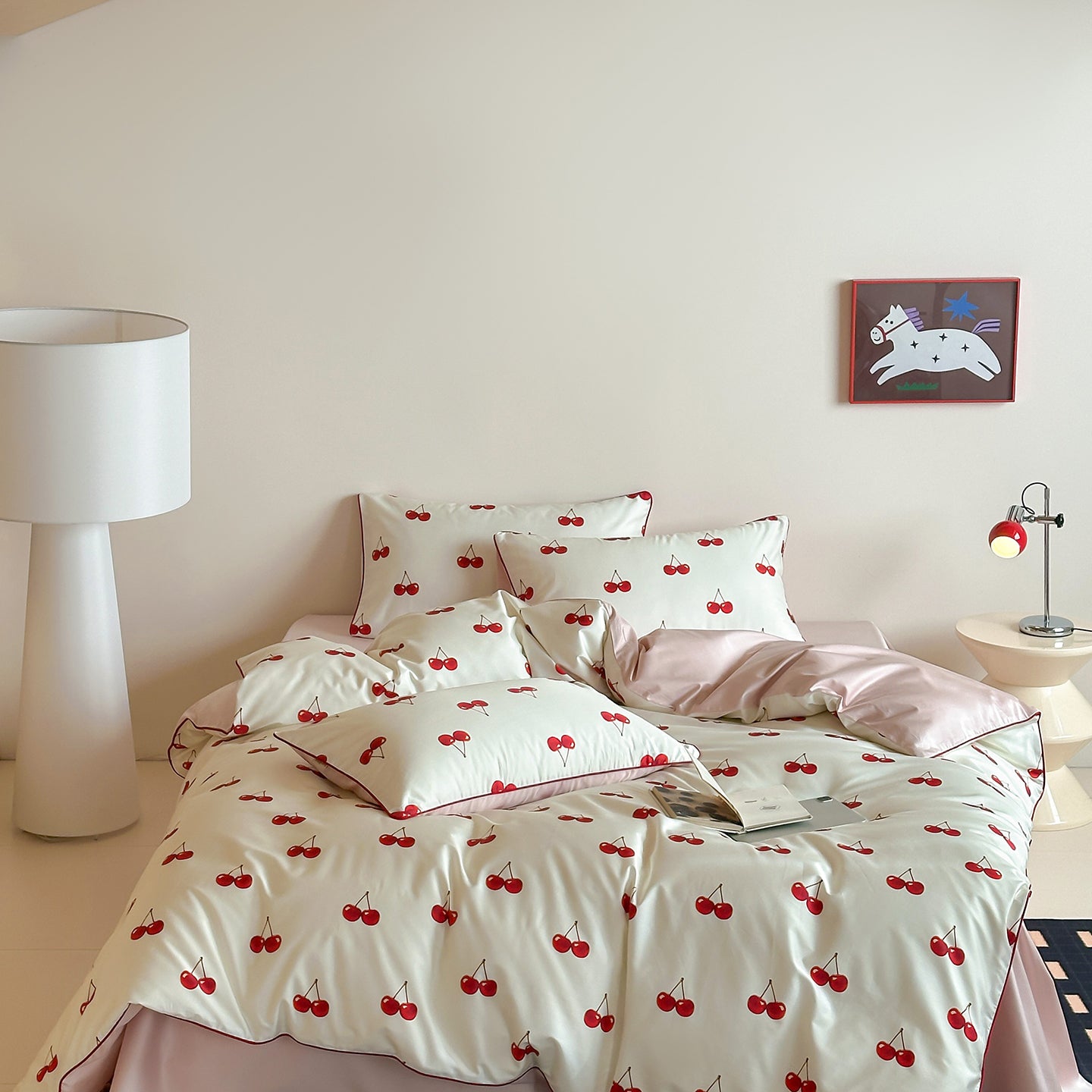 Let plump cherries fill your bedroom with sweet whispers of spring. Crafted from soft, breathable cotton, it rests lightly against your skin effortless, airy, made for deep, uninhibited sleep. Scattered across a serene base, vibrant cherries bring a touch of freshness and life to your space. Every time you lie down, it’s a gentle embrace between you and the cotton, guiding you into peaceful, restful dreams wrapped in sweetness.