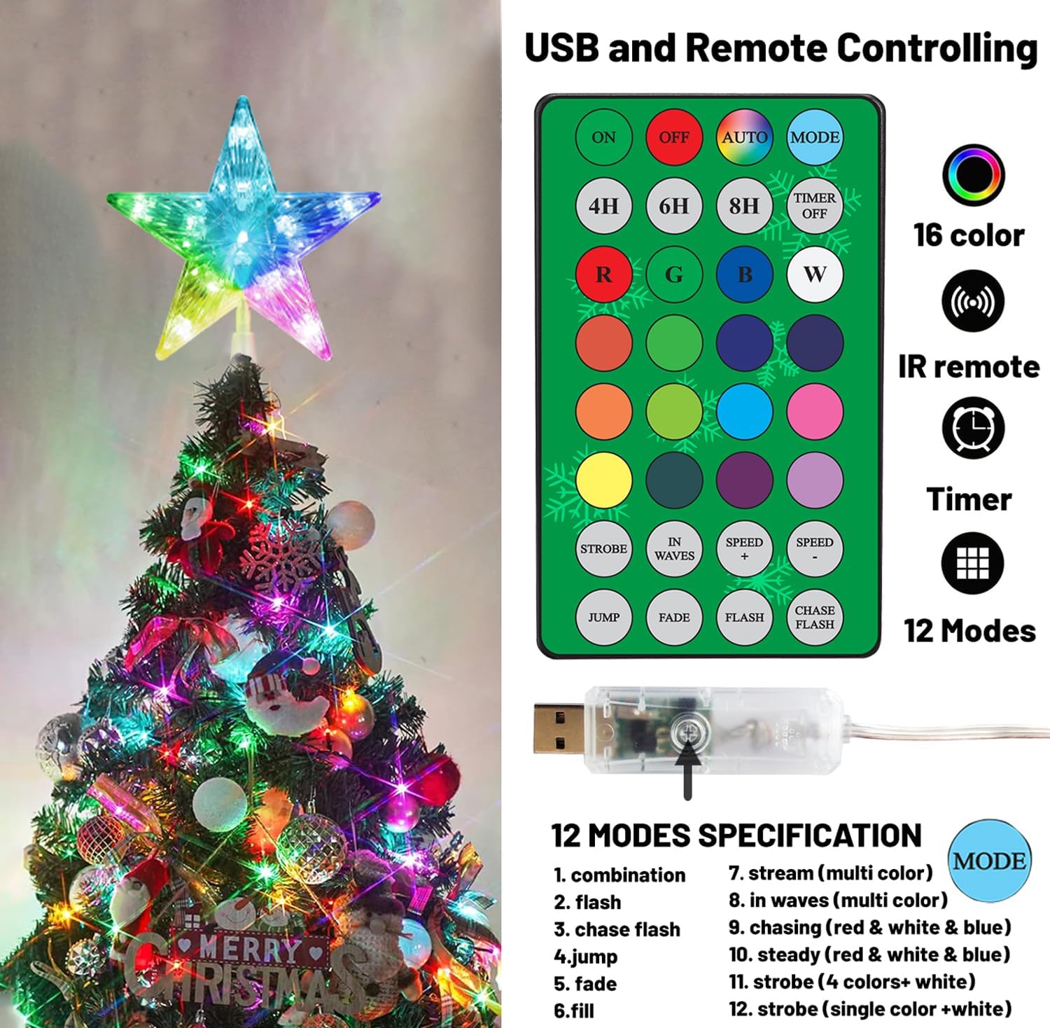 Color Changing: Equipped with 10 RGB LED lights, offering rich color options and modes. It's like having multiple tree toppers in one, such as red, white, solid, or flashing. Truly fantastic!