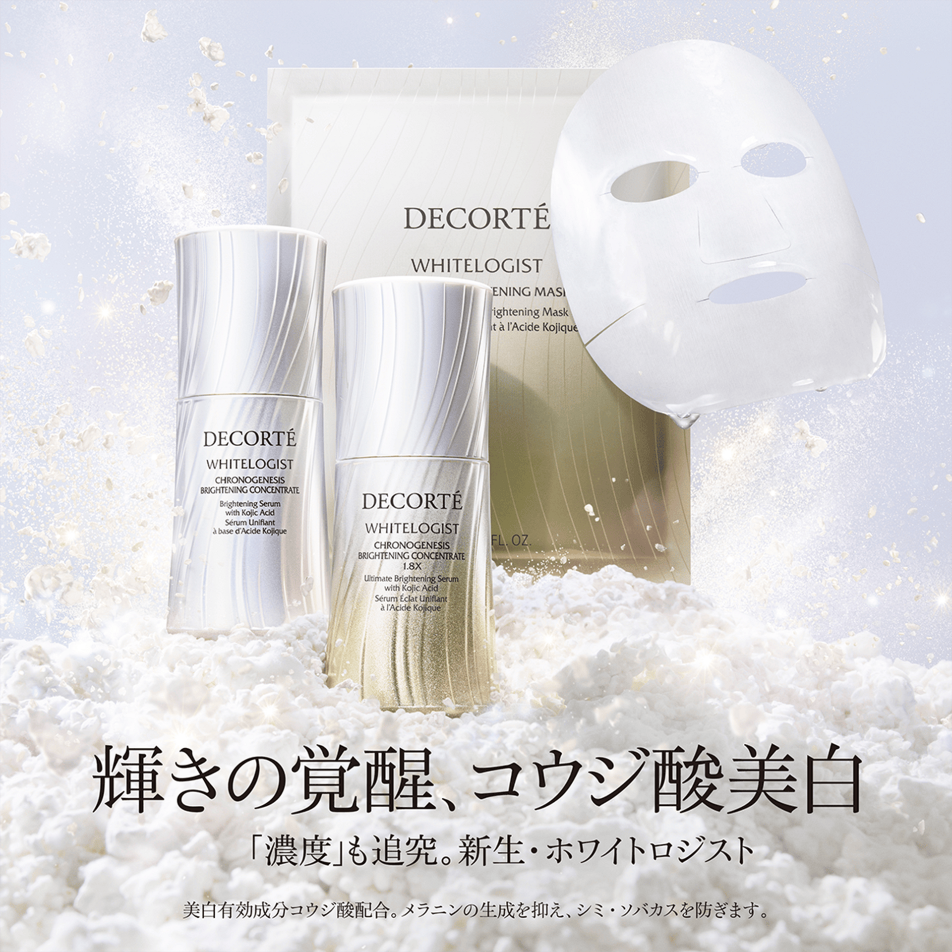 An intensive, fast-acting brightening mask that seals in 2.5× higher concentration of kojic acid, instantly delivering radiance and dewy, translucent skin. The sheet is precisely designed and adjusted down to a 1 mm-level fitting for superior adhesion. Formulated with “Deep Aura Optimizer”, it reveals a luminous, glowing complexion from the moment the mask is removed.