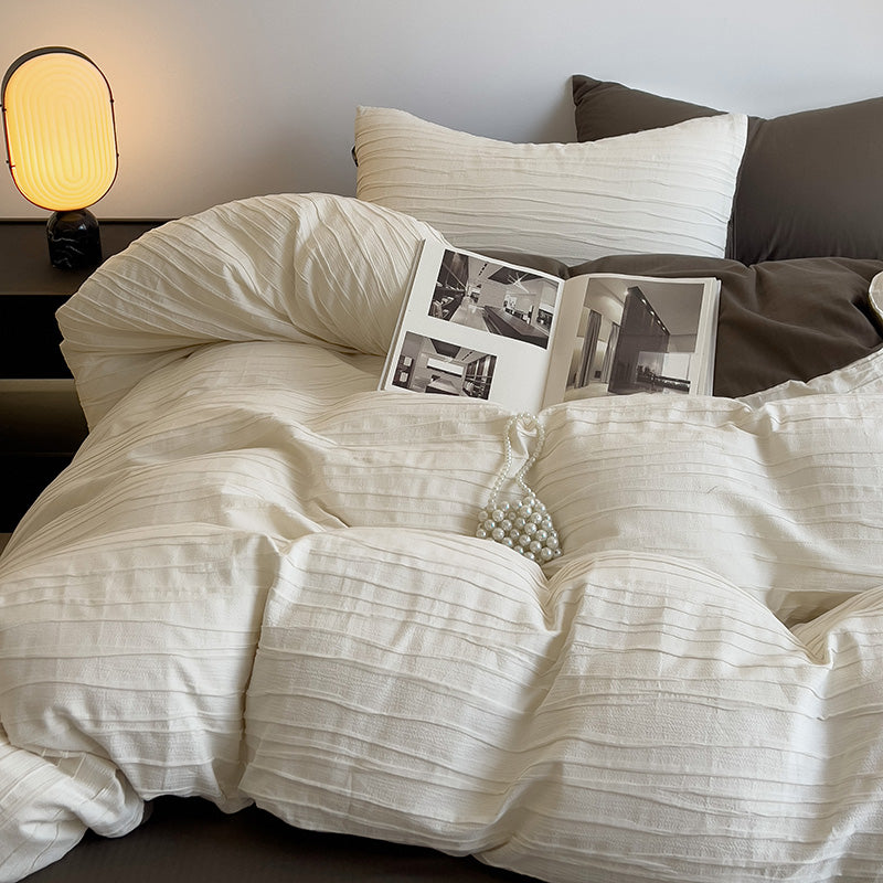 采用独特绉绉纱工艺,赋予面料天然生动的凹凸肌理感与卓越透气性。触感软糯亲肤,带着复古的舒适与安心。低饱和色调,渲染出宁静慵懒的卧室氛围,为您打造一个充满故事感的睡眠空间。