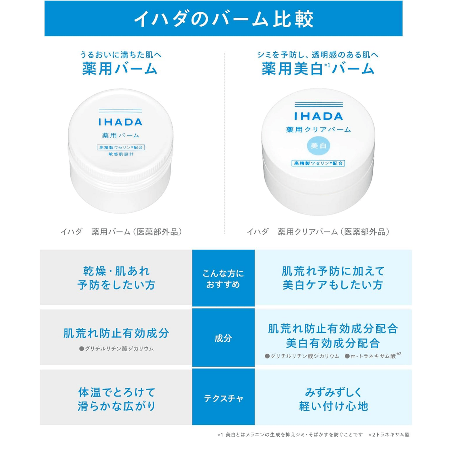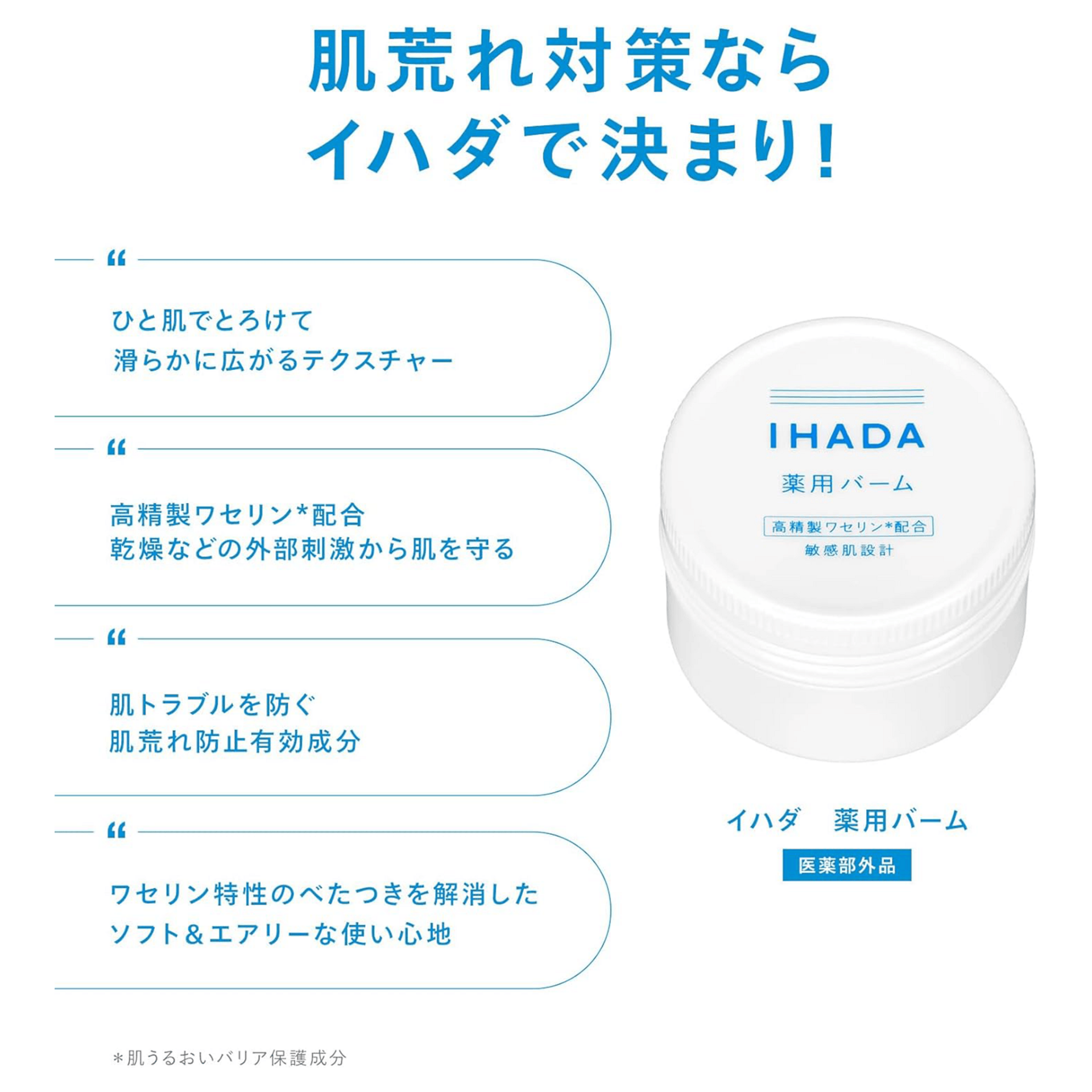 IHADA Medicated Balm is formulated with highly purified petrolatum to create a protective moisture barrier that locks in hydration and helps prevent dryness and recurring skin irritation; its balm texture melts smoothly upon contact with skin, spreading like a beauty oil while adhering closely without stickiness; designed for sensitive skin, it provides daily moisture protection and strengthens the skin barrier for healthier skin.