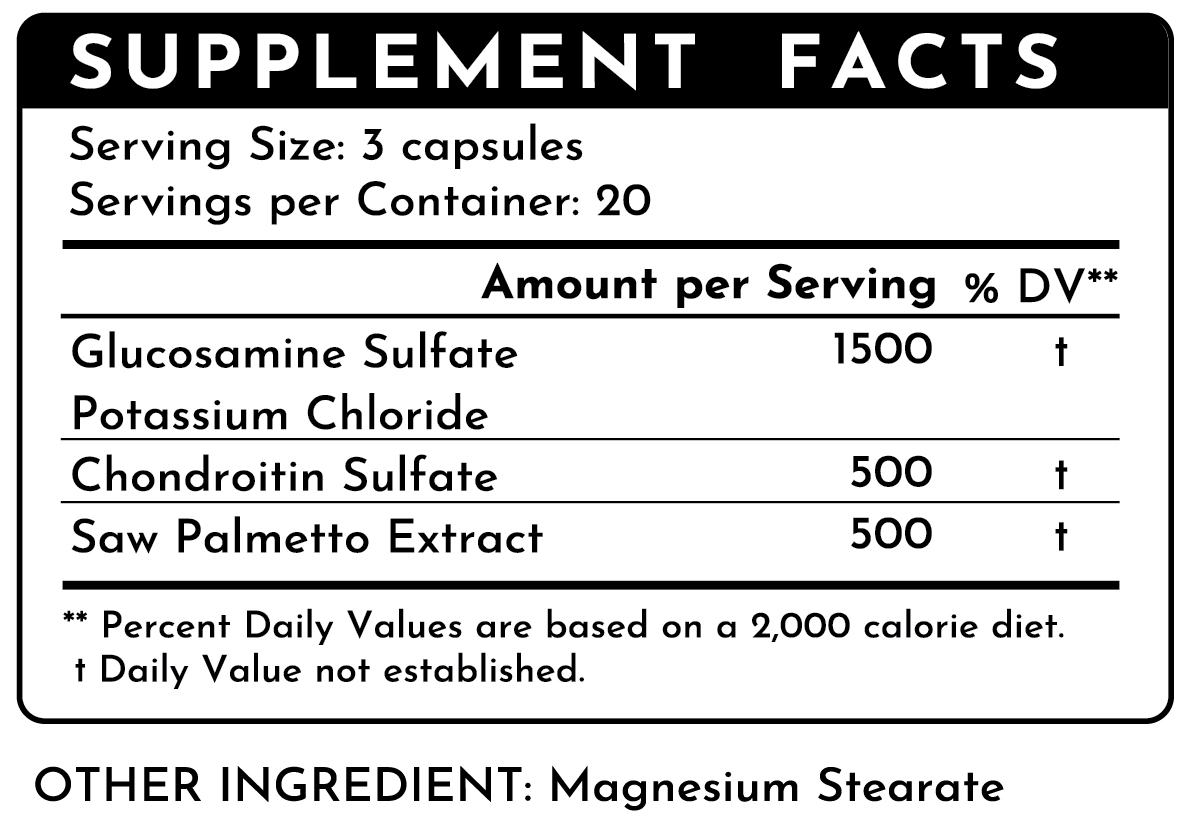 Discover the power of our unique blend featuring Glucosamine, Chondroitin, and Saw Palmetto extract. This advanced formula helps: