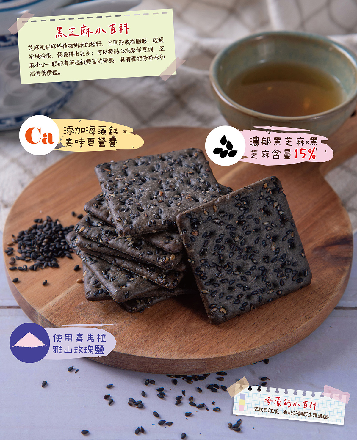 高達15%濃郁芝麻醬與發酵麵糰融合,餅體撒上飽滿黑芝麻顆粒,散發出醇厚的芝麻香氣,完美呈現色、香、味俱全的黑芝麻餅;精心添加喜馬拉雅山脈玫瑰鹽,鹹甜不膩,不添加味精、防腐劑、人工香料,給您營養的美味!