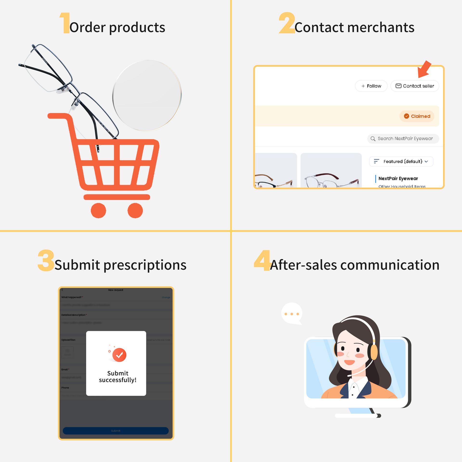 Step 1: Select the product: Pick the frames and lenses you like, add them to the shopping cart and place an order.