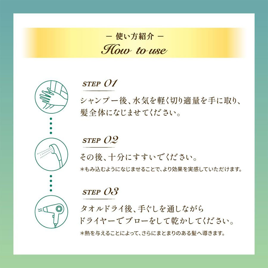 洗发后,轻轻拭去头发多余的水分,取适量产品均匀涂抹于头发上。