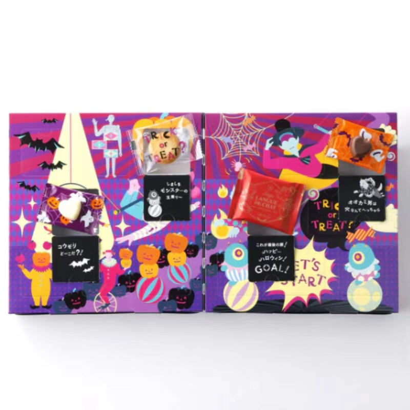 打開盒子的小門,裏面藏着「貓舌餅乾」、餅乾和巧克力等五彩繽紛的甜點。根據門背後的提示一步步尋找下一個驚喜,這是一款充滿趣味的萬聖節限定禮盒。