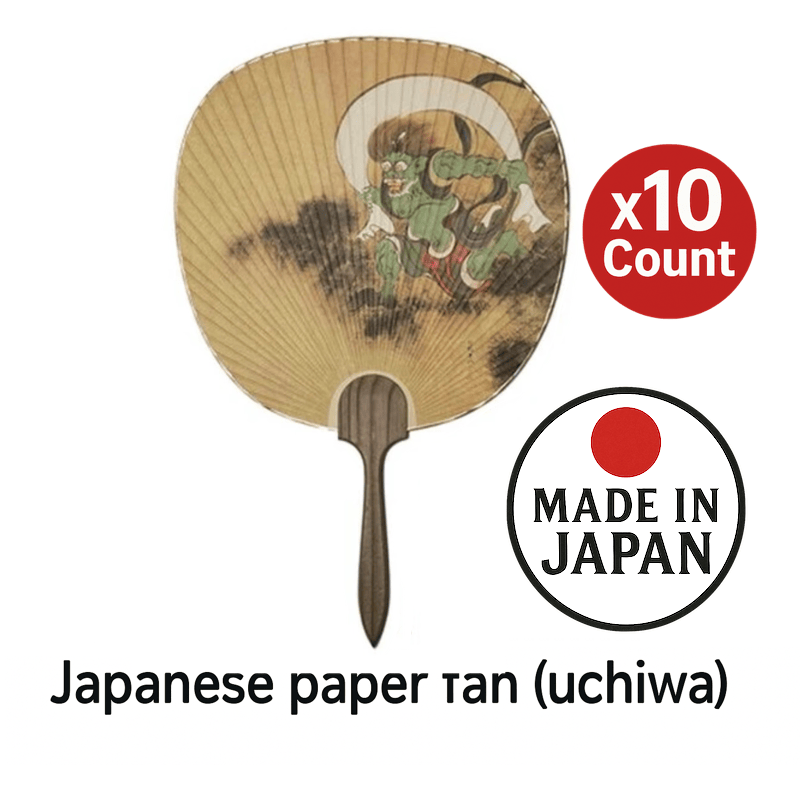 This Japanese paper fan ("uchiwa") features a print of Fujin, the Japanese god of wind, inspired by traditional ukiyo-e art. Fujin is a famous mythological figure often depicted alongside Raijin, the god of thunder. Perfect for daily use, Japanese festivals, interior decor, or as a unique gift.