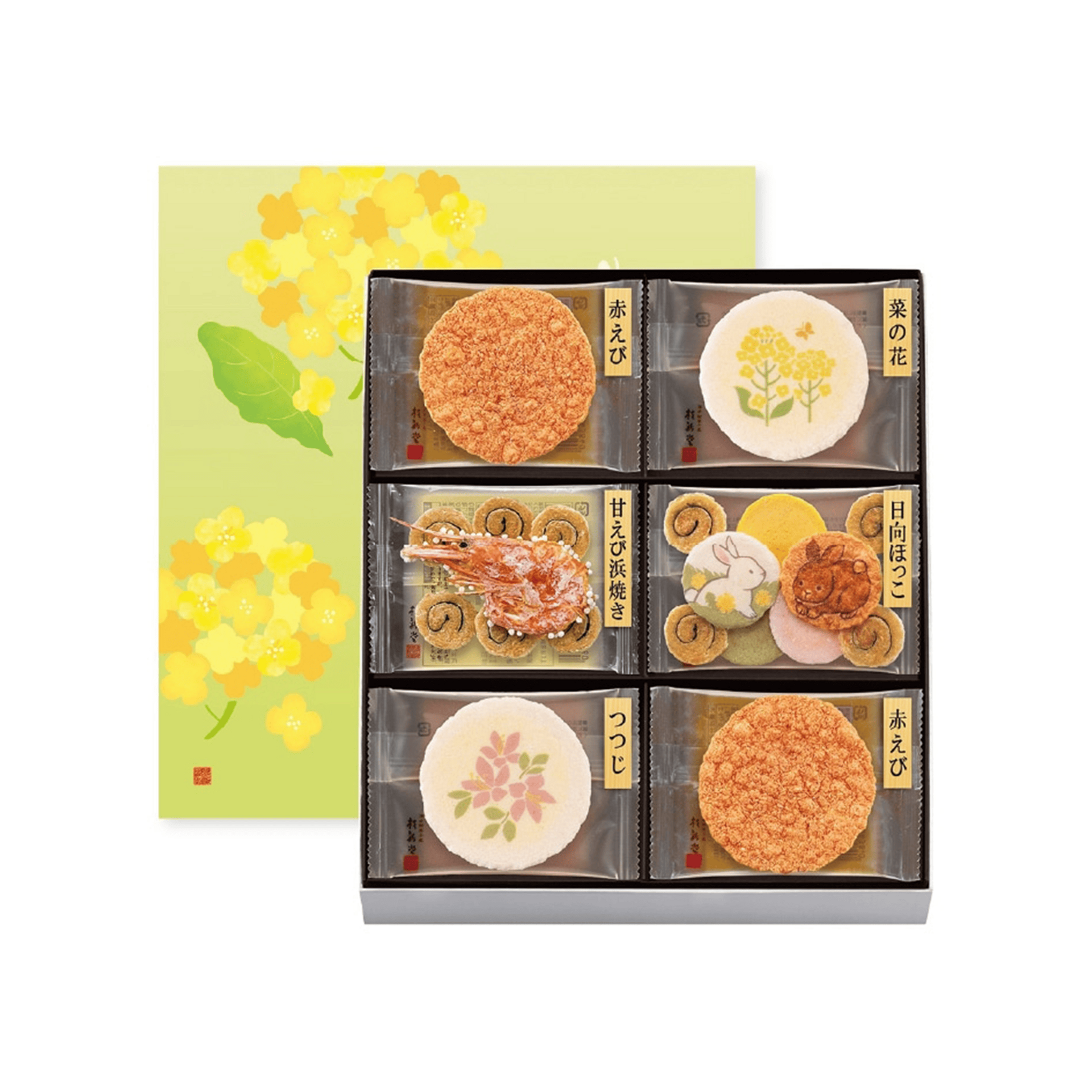 菜の花×3袋。つつじ×3袋。日向ぼっこ(うさぎ[白]1枚・うさぎ[茶]1枚・梅えびせんべい1枚・南瓜えびせんべい1枚・抹茶えびせんべい1枚・渦巻き4枚)×2袋。甘えび浜焼き(甘えび浜焼き1枚・渦巻き6枚)×2袋。赤えび炙り焼き×6袋。