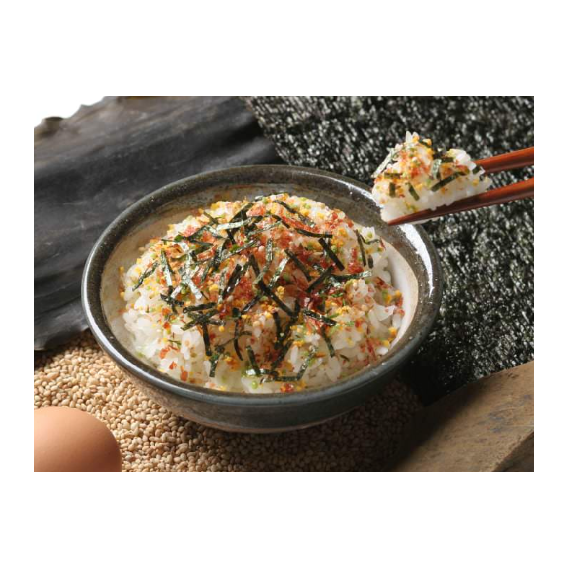 尽享六种不同风味的旅行伴侣:鲣鱼味醂烧、紫菜蛋、海藻、三文鱼、鳕鱼子。