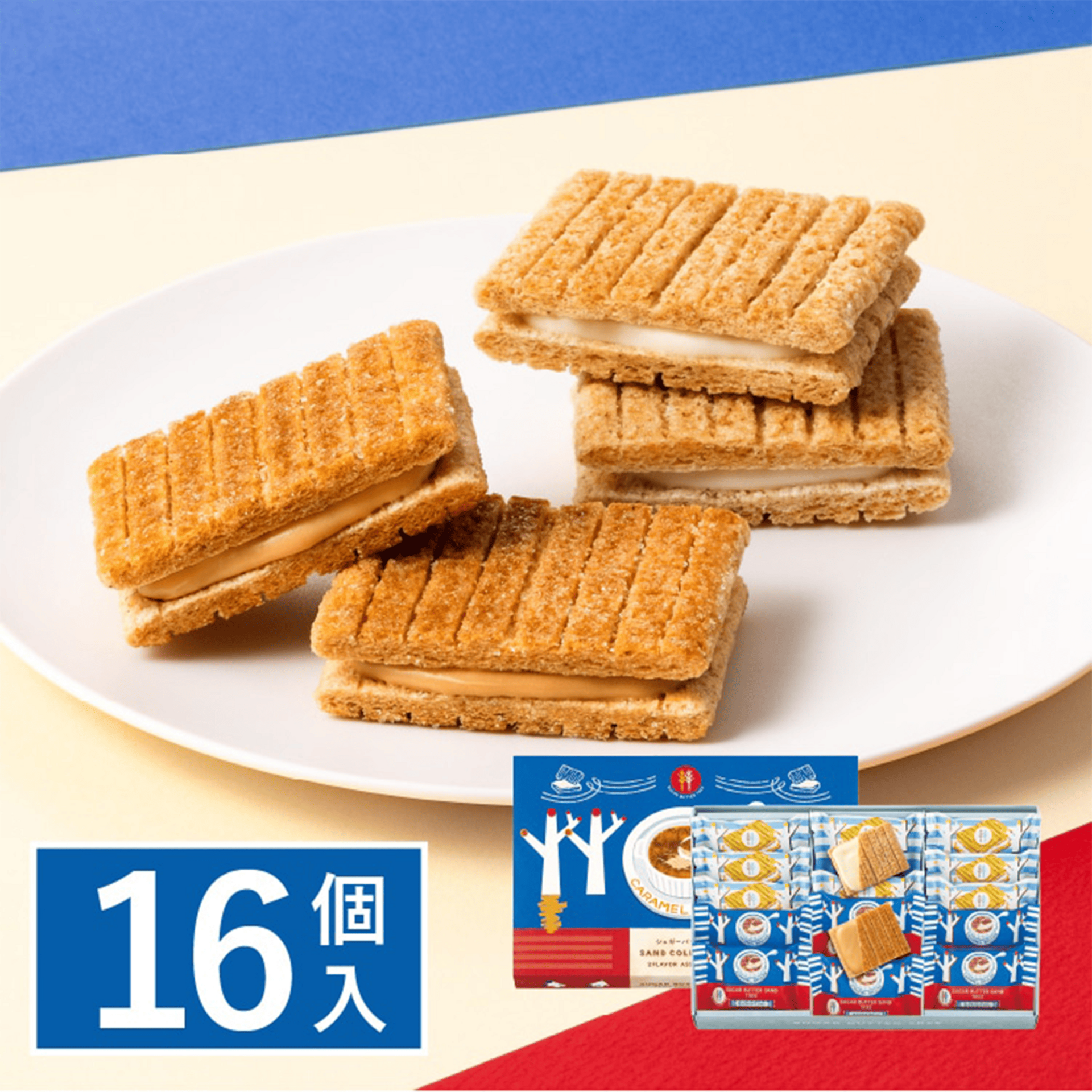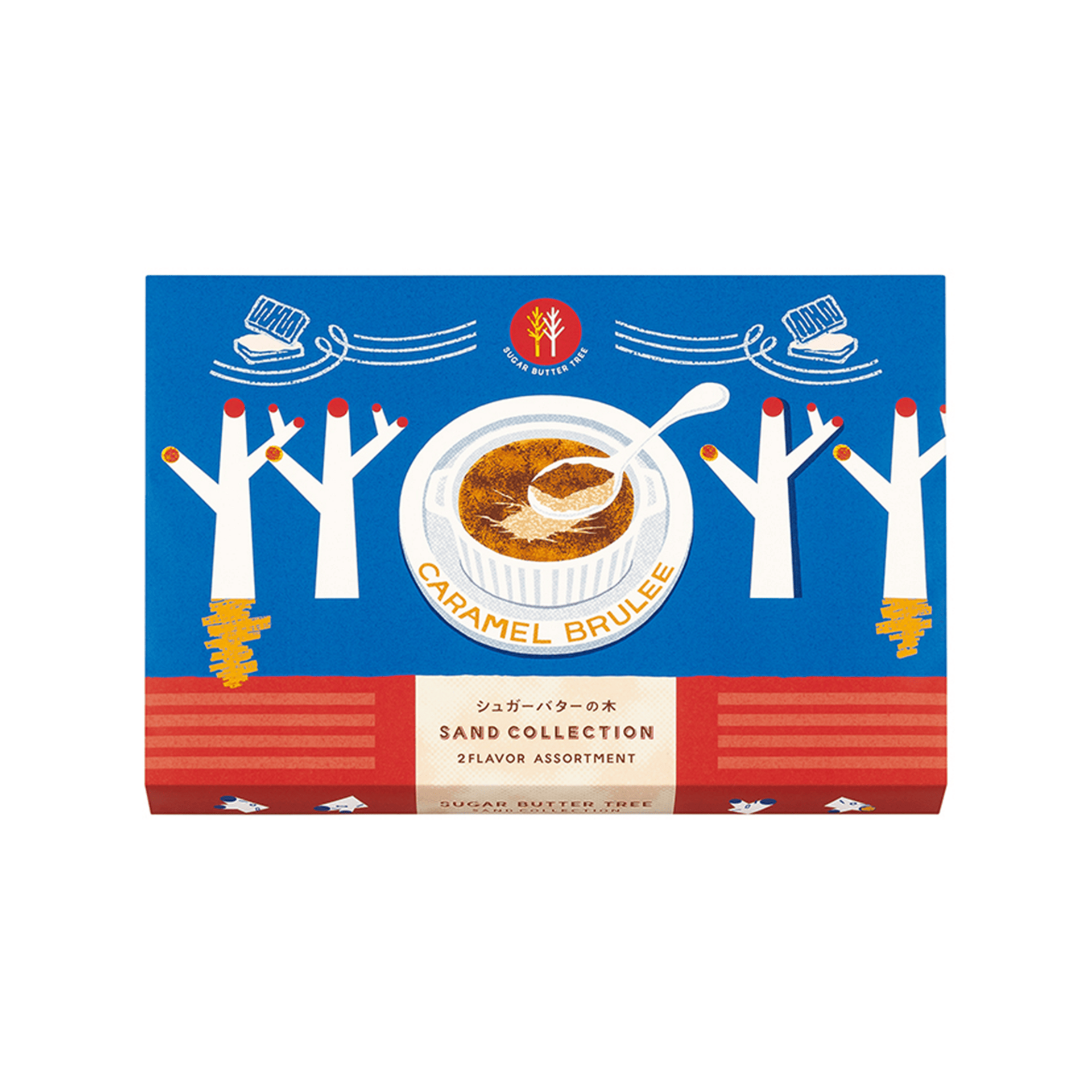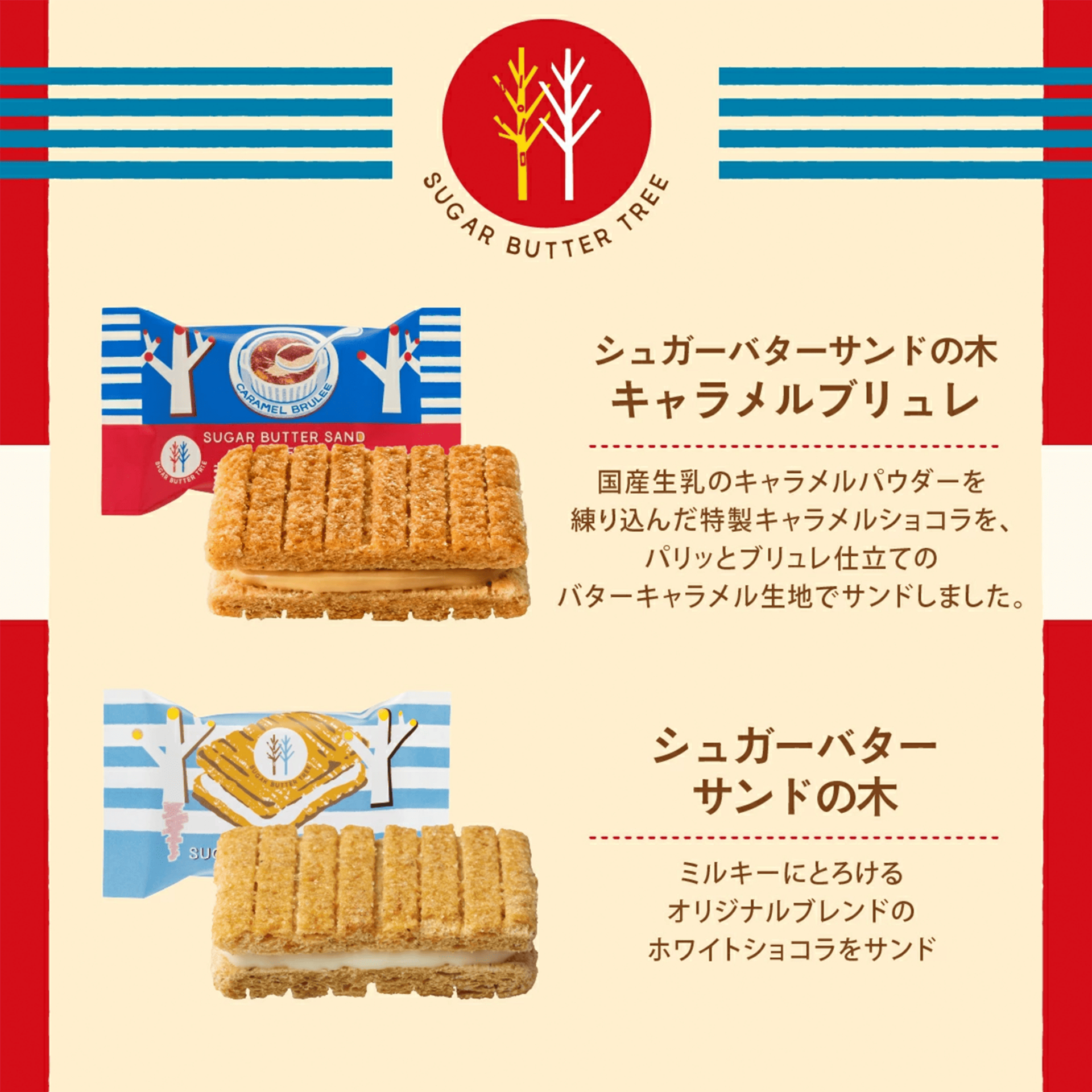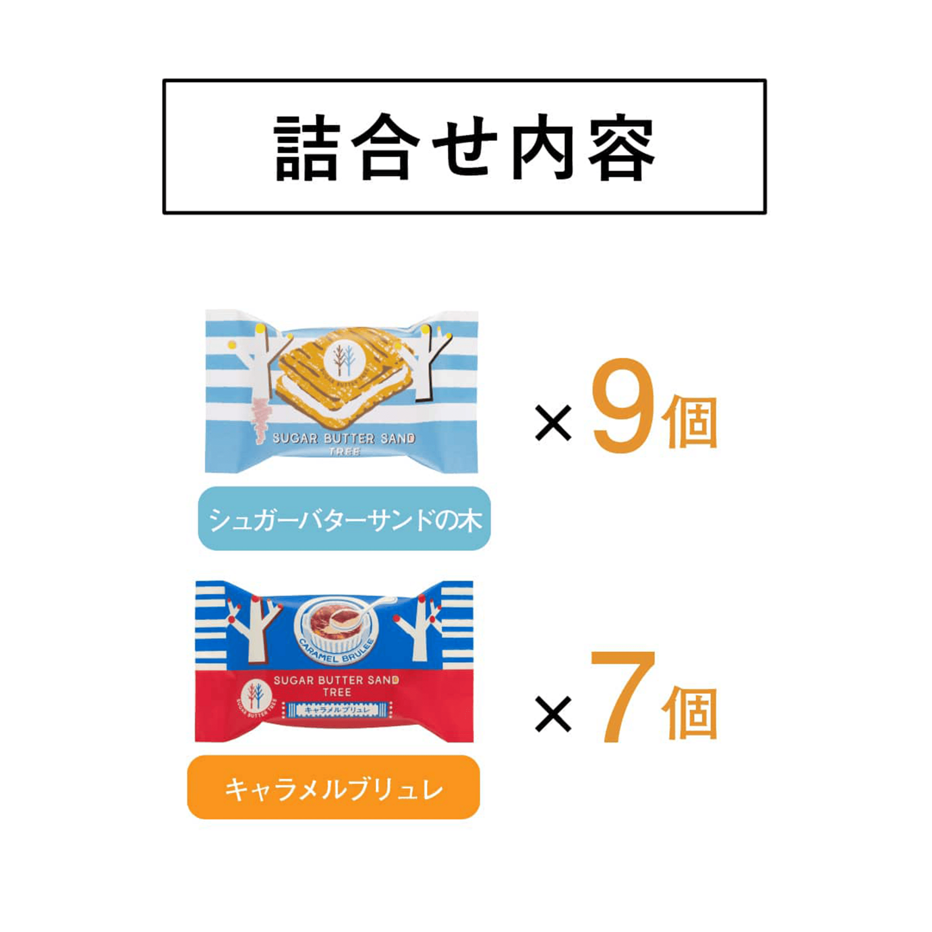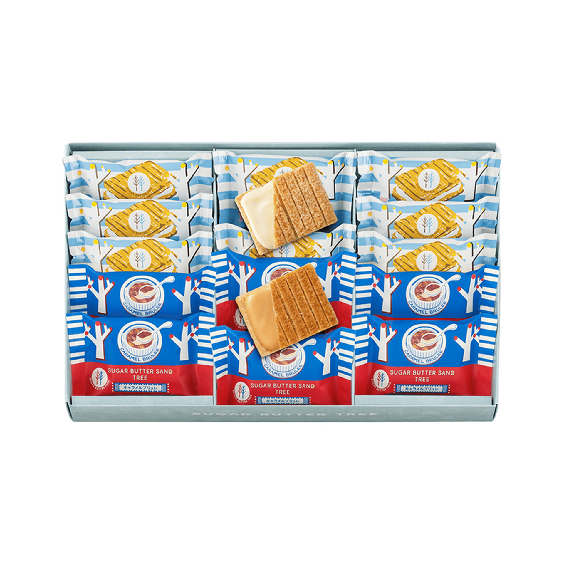 Sugar Butter Tree Classic Sandwich × 9pcs, Sugar Butter Tree Caramel Brulee Sandwich × 7pcs. A refined assortment combining the classic sugar butter flavor with rich caramel brulee. Crisp cereal cookies paired with creamy filling create a perfectly balanced and elegant gift set.