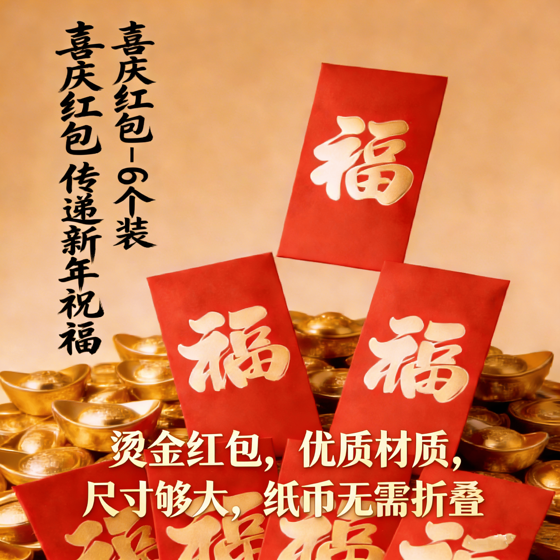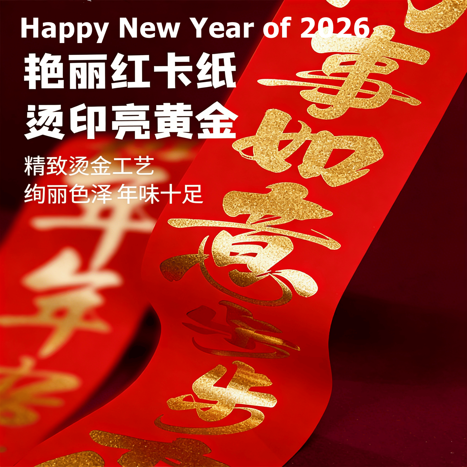 Features: Deep red paper with raised gold foil lettering. Includes tasteful English lettering “Good Luck & New Year” for a modern cultural fusion.