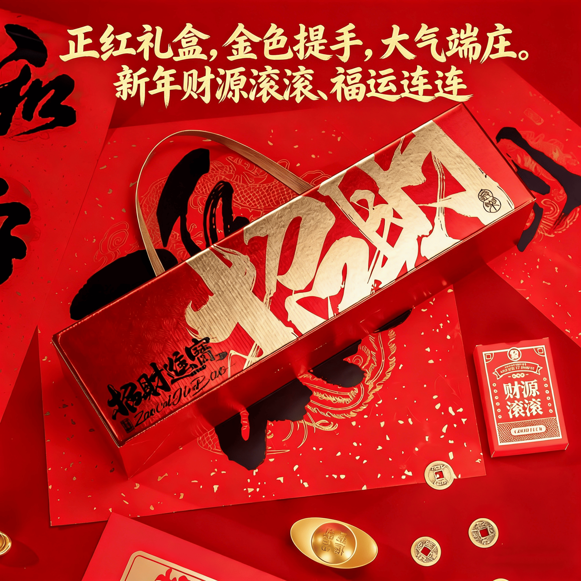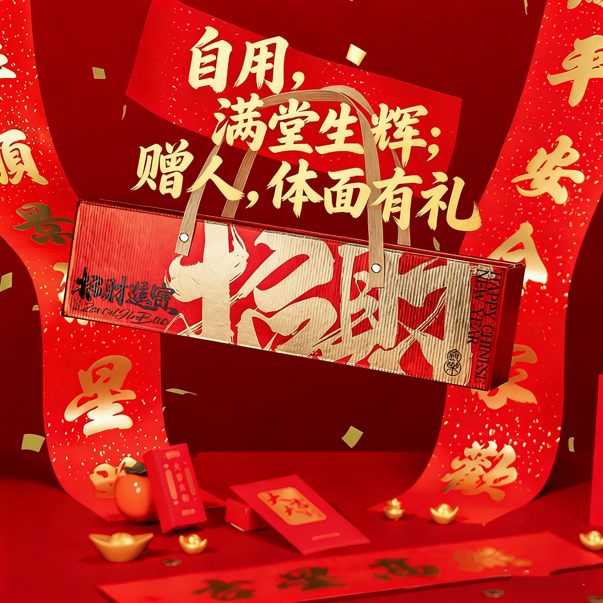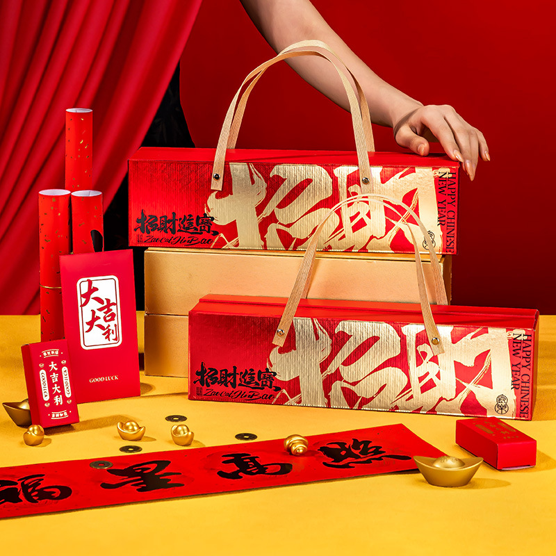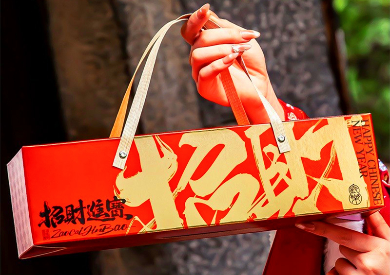 Rich red box with a golden rope handle, adorned with embossed gold characters “Zhāo Cái Jìn Bǎo” (Welcoming Wealth & Treasures). Luxurious to hold, beautiful to display — an immediate symbol of prosperity and festive spirit.