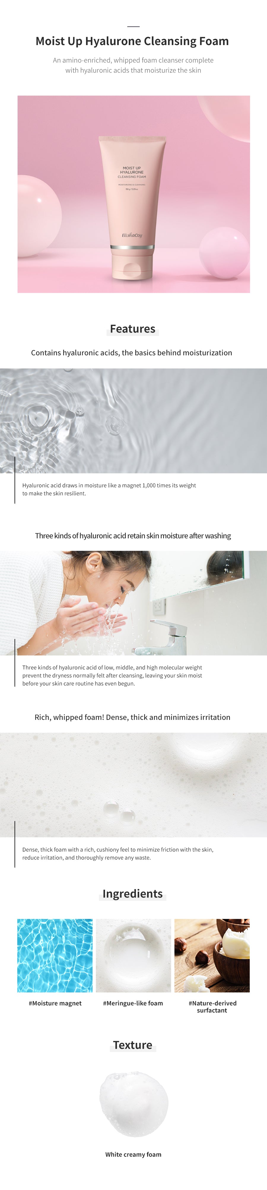 ヒアルロン酸とアミノフォームを含む純粋でしっとりしたフォームクレンザー三重ヒアルロン酸含有で洗顔後もしっとりとしなやかな顔に整え、乾燥感から肌のすべての層を保護してくれます!ココナッツから抽出した天然界面活性剤は、洗顔後の即時の水分損失を防ぎます。メレンゲをホイップしたように、柔らかく豊かな泡でケラチンと化粧の残りを完全に取り除きます。