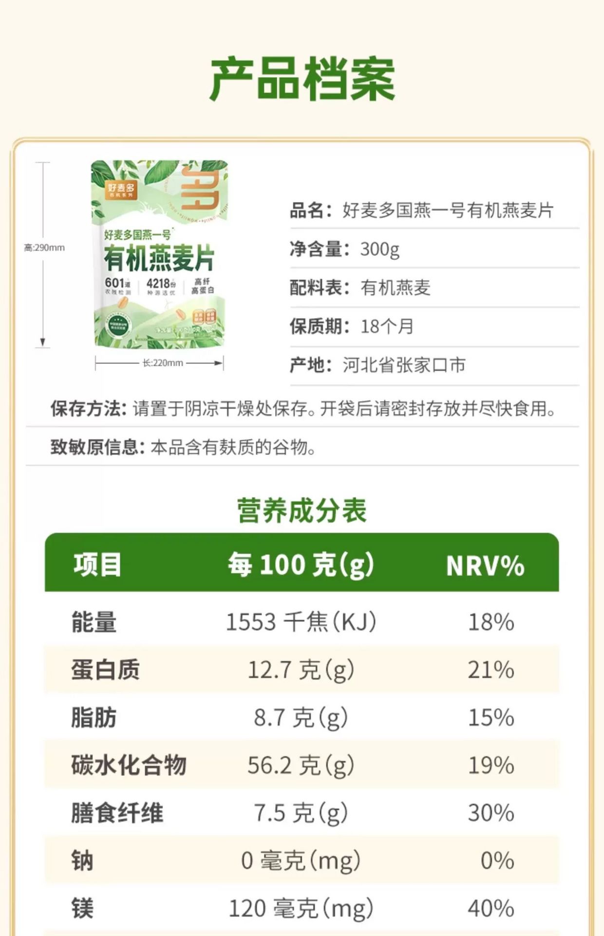 Haomaiduo Organic Oatmeal 300 그램