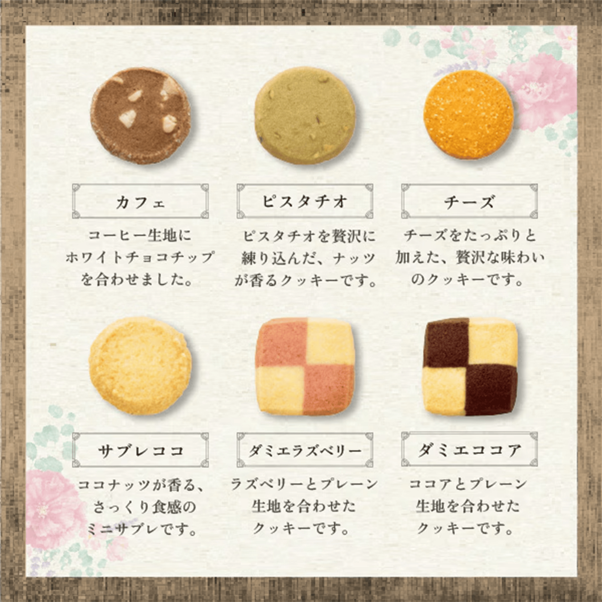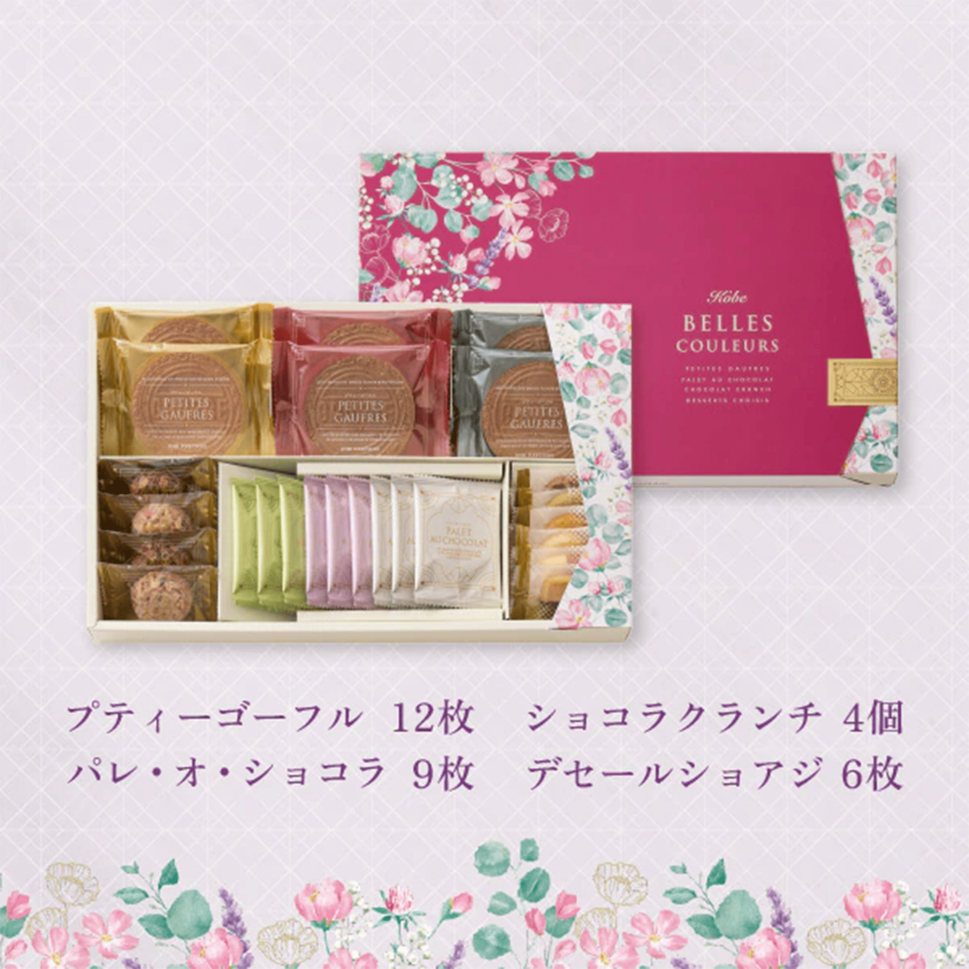 Petite Gaufres 12 pcs (Vanilla, Amaou Strawberry, Matcha / 2 wafers each × 2 packs), Chocolate Crunch 4 pcs (Milk 2 pcs, Berry Sparkling 2 pcs), Palet au Chocolat 9 pcs (Plain, Amaou Strawberry, Rich Matcha / 3 cookies each), Dessert Choisi Cookies 6 pcs (Café, Pistachio, Cheese, Coconut Sablé, Raspberry Damier, Cocoa Damier / 1 each)