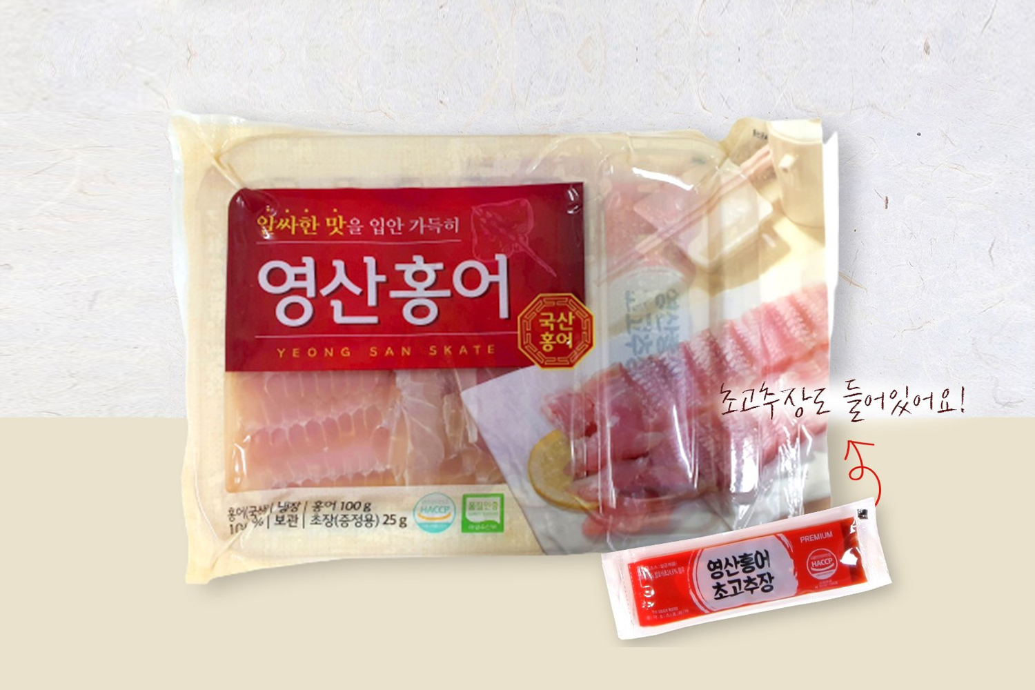 內含一包裝切片洪魚及一包醋辣醬。