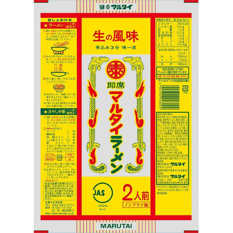 1966年上市的條形方便麪的先驅產品。麪條採用非油炸、非蒸煮方式製成,是具有與新鮮麪條相似風味的直面。湯以豬肉和雞肉爲湯底,味道濃郁,帶有淡淡的醬油味。這是65週年紀念套餐。
