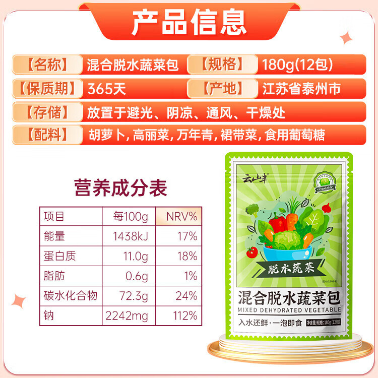 混合脱水蔬菜干 包独立包装0添加 180 克
