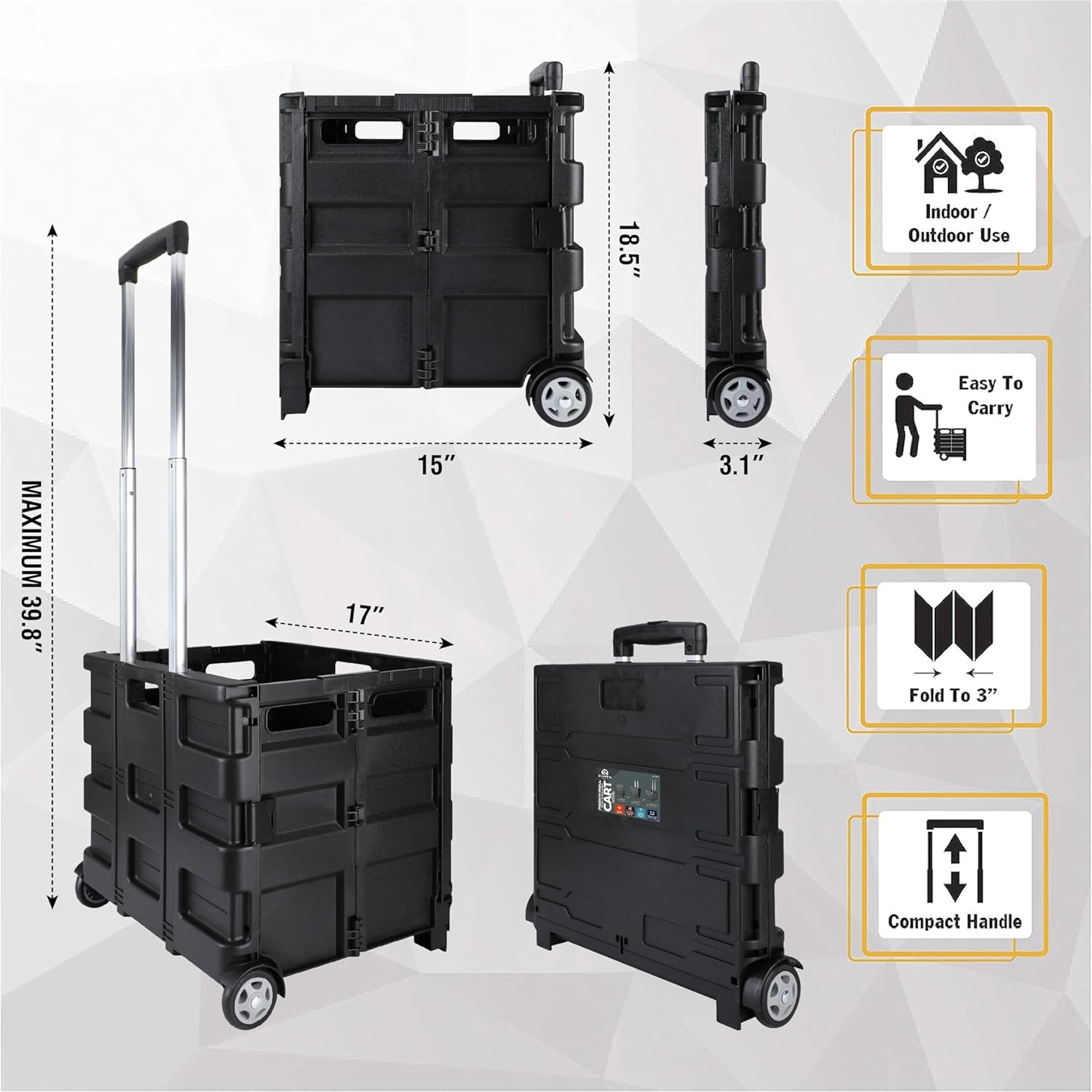 Lightweight, durable, rust proof plastic construction . Telescopic aluminum handle. Convenient and compact; folds down flat for storage. 80 lbs. weight capacity. Folded: 3 in. x 18 in. x 18 in.. Extended: 14.5 in. x 18 in. x 39 in.. inner: 12.5 in. x 15.5 in. x 13.5 in.. Weight: 7.2 lbs.