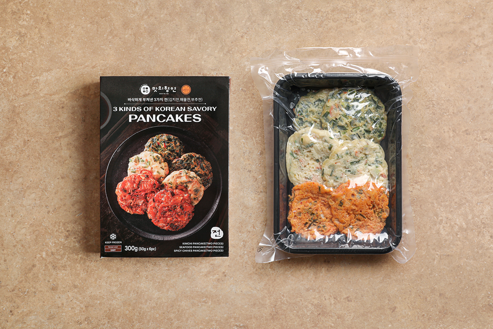 Each package contains 2 pieces of Kimchi Pancake, Seafood Pancake, and Chive Pancake, each weighing 50g.