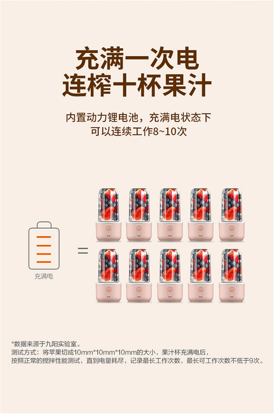 Fully charged once, squeeze ten cups of juice in a row.