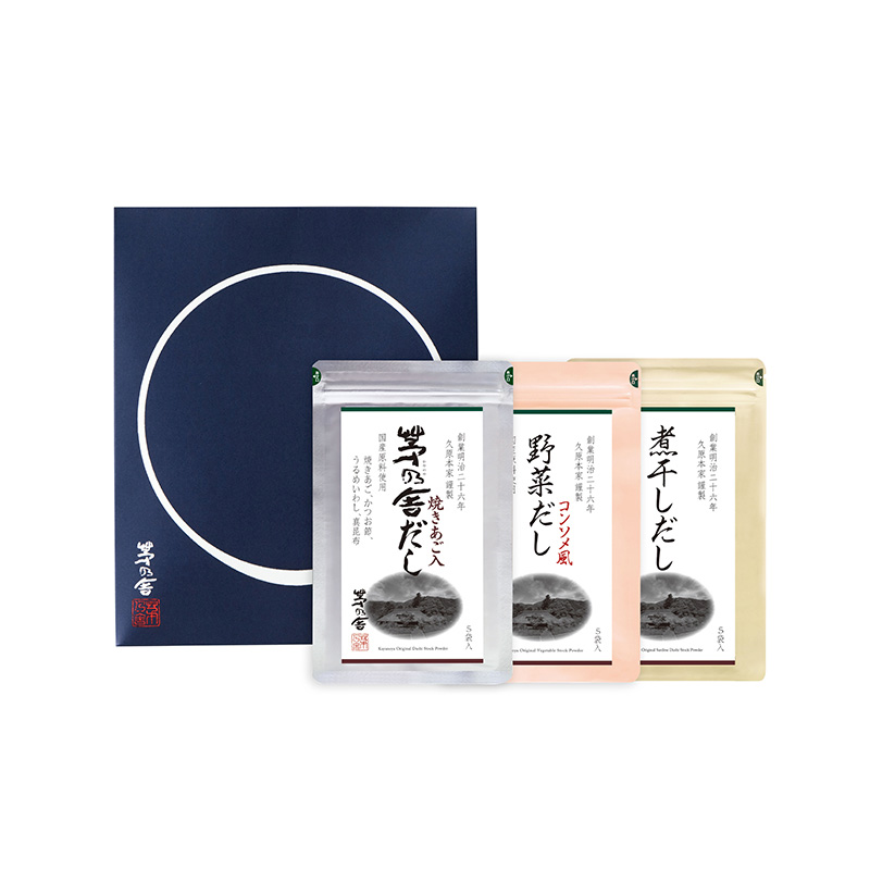 Kayanoya Dashi 3 Variety Set includes three types of Japanese soup stock in a convenient gift bag with a gusseted design.