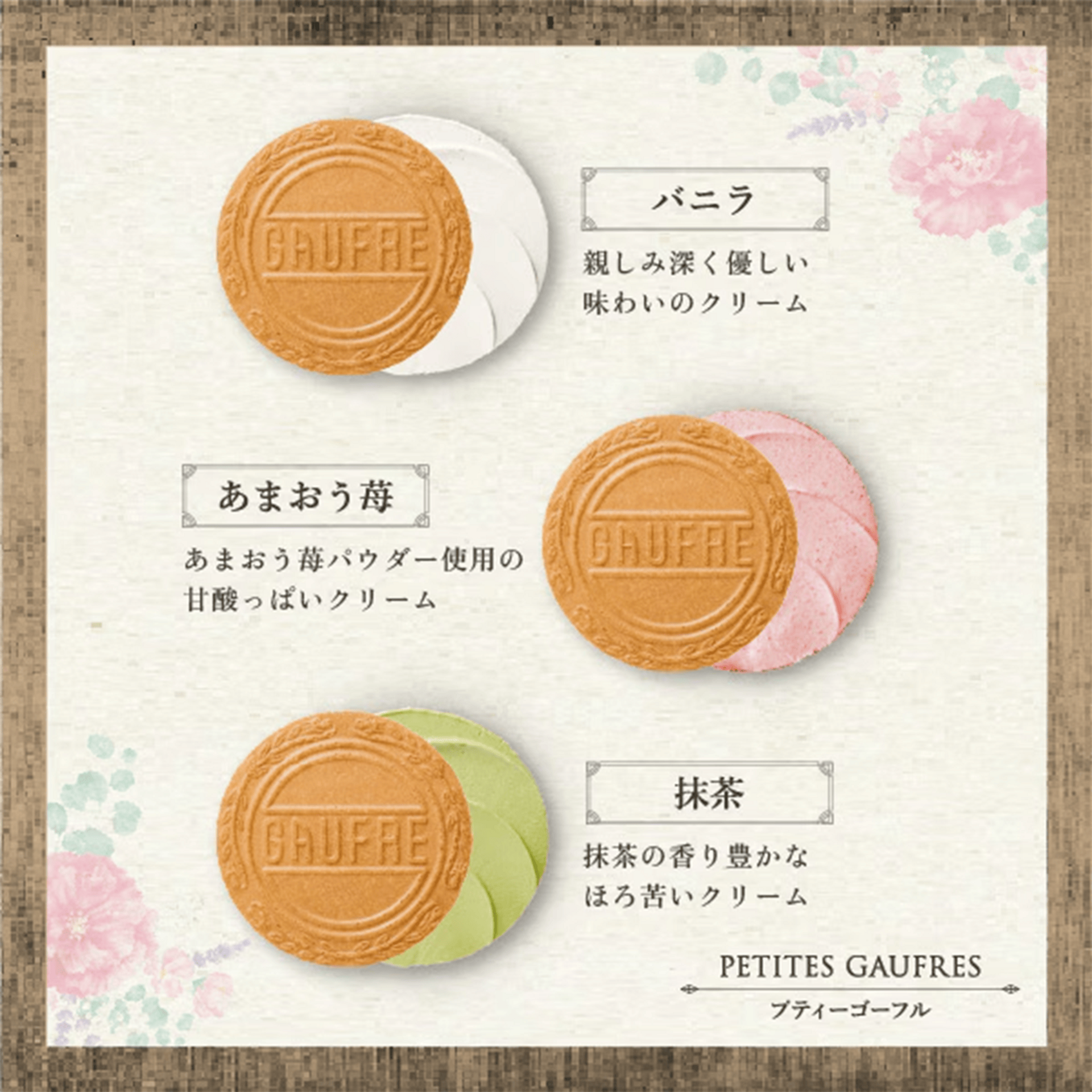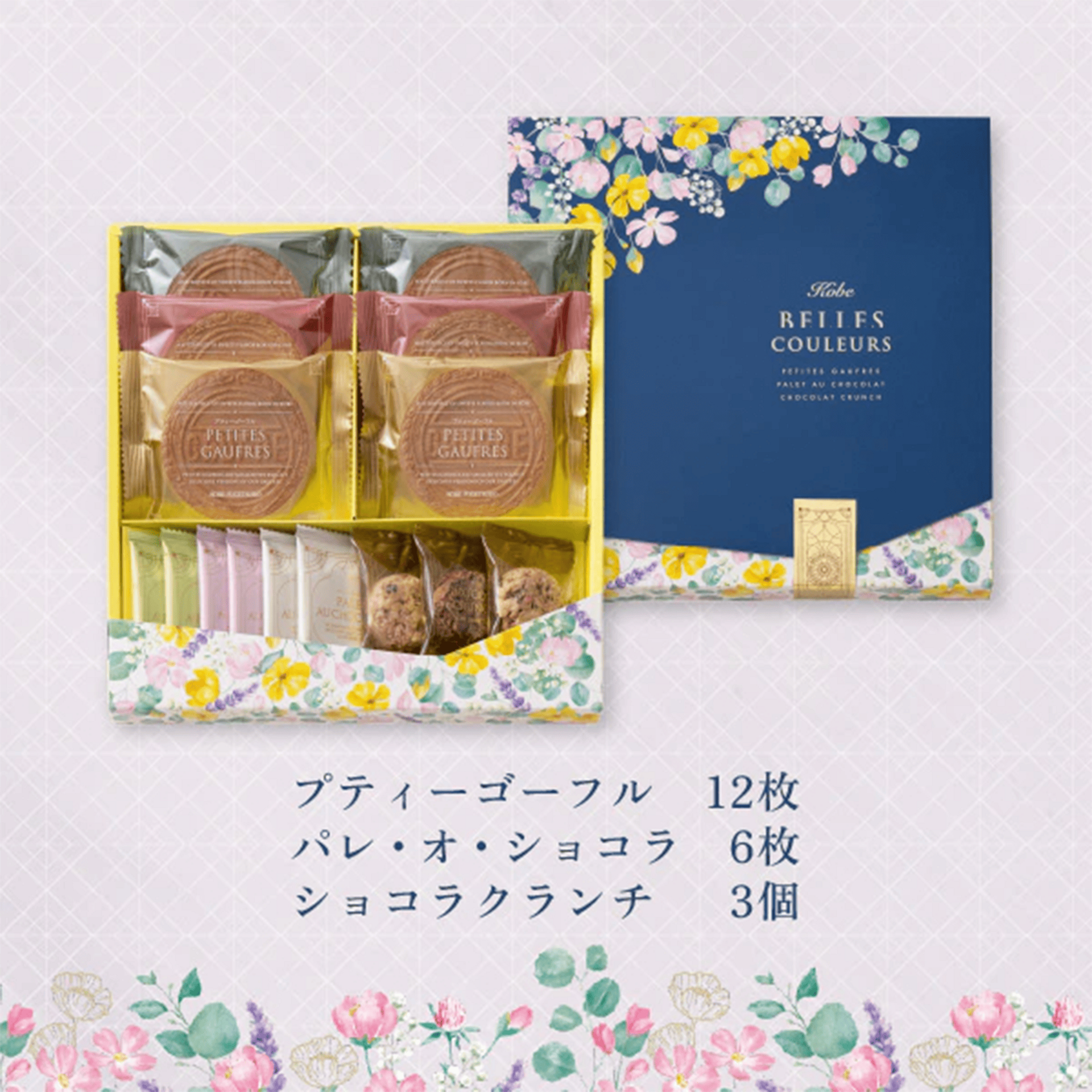 Petite Gaufres 12 pcs (Vanilla, Amaou Strawberry, Matcha / 2 wafers each × 2 packs), Palet au Chocolat 6 pcs (Plain, Amaou Strawberry, Rich Matcha / 2 cookies each), Chocolate Crunch 3 pcs (Milk 1 pc, Berry Sparkling 2 pcs)