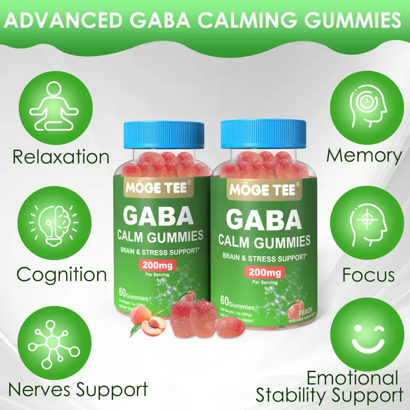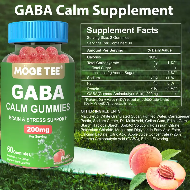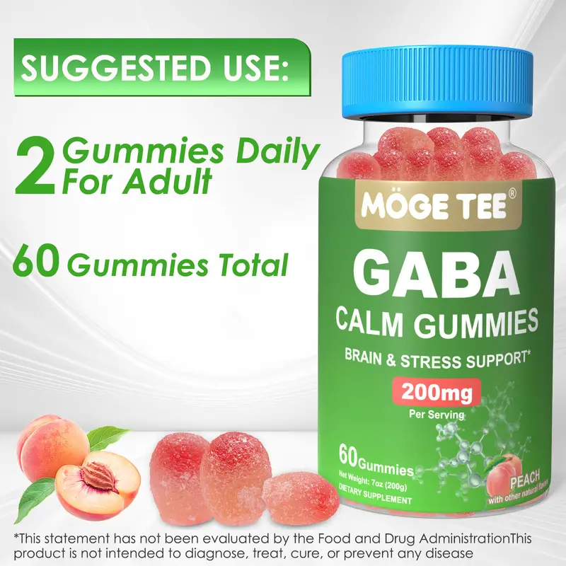 Health Assistant: GABA gummies are made from high-quality gamma-aminobutyric acid, a natural amino acid that support calm and stress. Gummies contain natural fruit extracts that provide a delicious peach flavor, adding essential nutrients to support your overall health.
