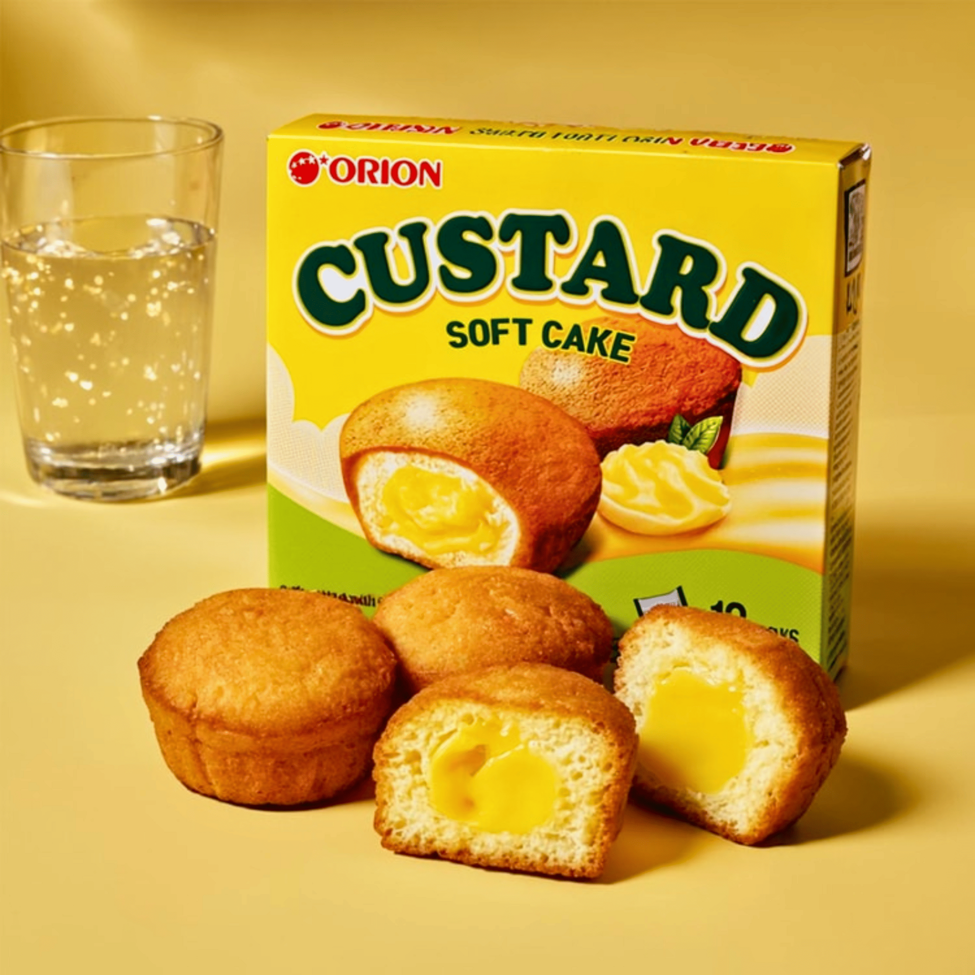 Orion Custard Soft Cake 9.73oz features fluffy sponge cakes filled with rich, creamy custard for a soft, sweet, and satisfying treat anytime.