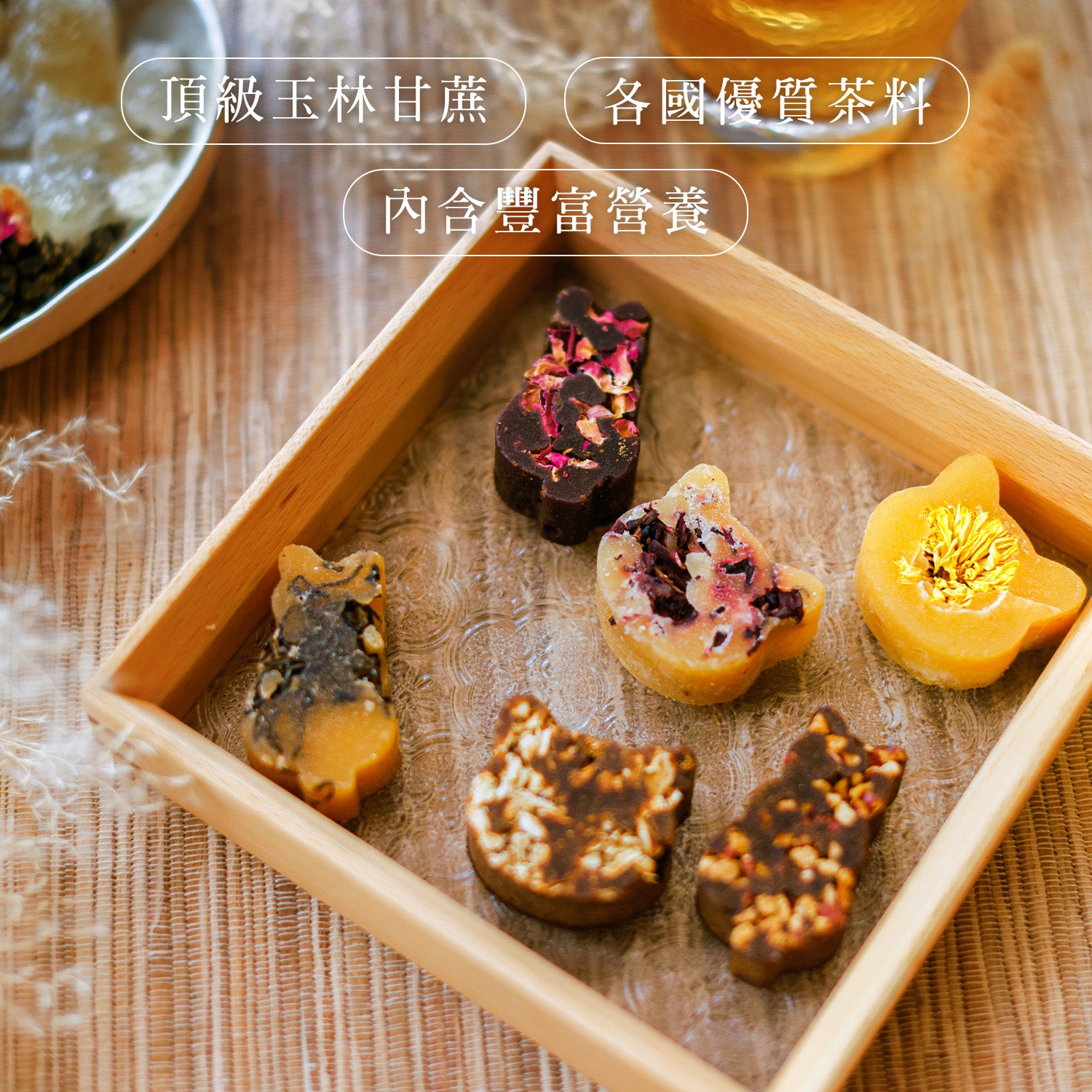 花研糖磚綜合茶有6款茶飲口味,每天隨心情選擇你的貓貓糖磚,達到不同養生效果。嚴選頂級玉林甘蔗,採用正宗台灣古方,經由16道工序匠心熬煮而成。獨立包裝,一杯一粒方便沖泡,可愛貓造型糖磚,讓人倍感療癒,暖意入心。