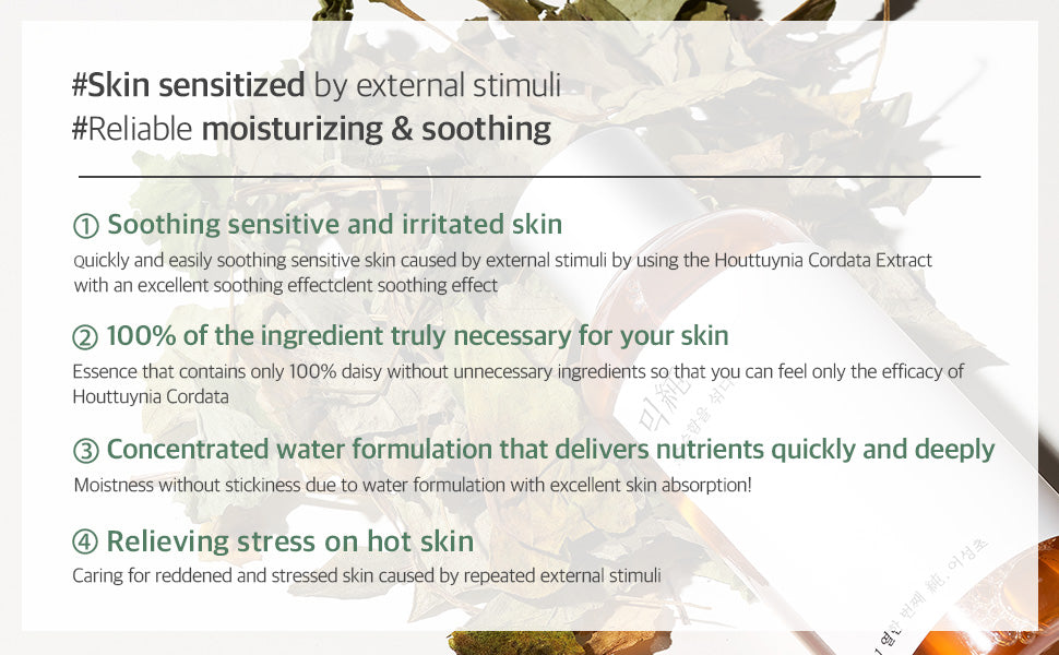 - 100% Heartleaf (Houttuynia Cordata) Extract. No alcohol. No artificial fragrance. A reliable EWG green grade essence that is also supplied to postpartum care centers, facials and spas. (*Results may differ based on the individual, so it is essential that you do a patch test before use.)