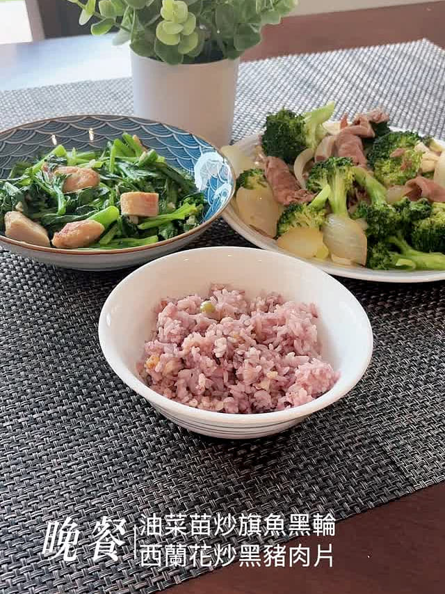 Dinner🍱Sautéed swordfish with rapeseed sprouts + stir-fried black pork with broccoli