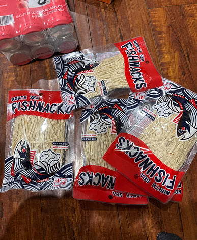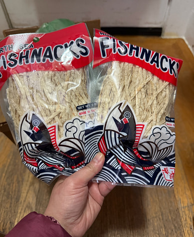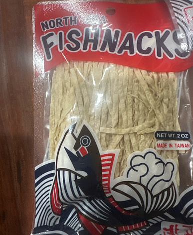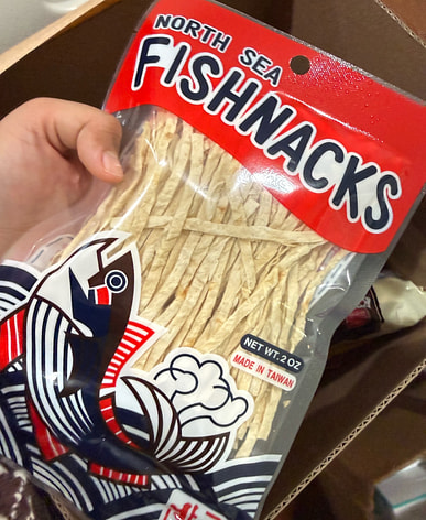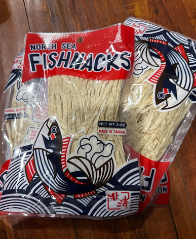 Tôi lại mua cá xé nhỏ vị cá tuyết; đây là món ăn vặt rất ngon.