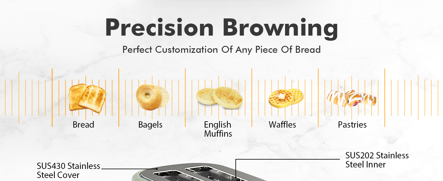 【6 檔精準烤麪包機】我們的 Longdeem 烤麪包機提供 6 檔烤麪包機,可烘烤全麥、白麪包、百吉餅、華夫餅、糕點和英式鬆餅,讓您體驗完美的烘烤體驗。只需選擇麪包,這款多功能設備便可確保每次都能獲得一致的金黃色效果。